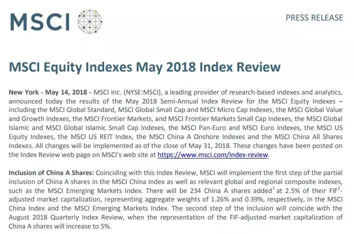 On 1st, Jun, 2018, MSCI will bring 234 Chinese A shares into the MSCI China Index, MSCI Emerging Markets Index and MSCI ACWI Index.