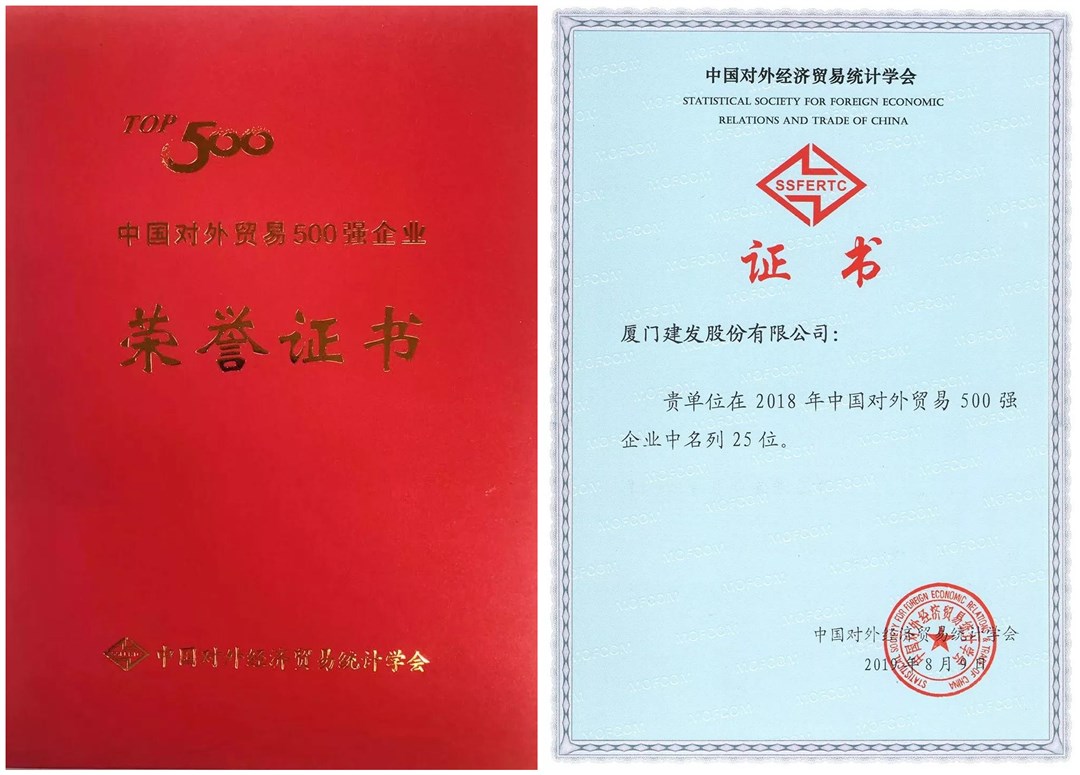 Xiamen C&D Inc. ranked 25th in China and 1st in Fujian province with a total import and export volume of 9.23 billion US dollars, according to 2018 annual ranking report of China's Top 500 foreign trade enterprises (2018) released by China Association of Foreign Economic and Trade Statistics, which is in the charge of China’s Ministry of Commerce in Haikou.