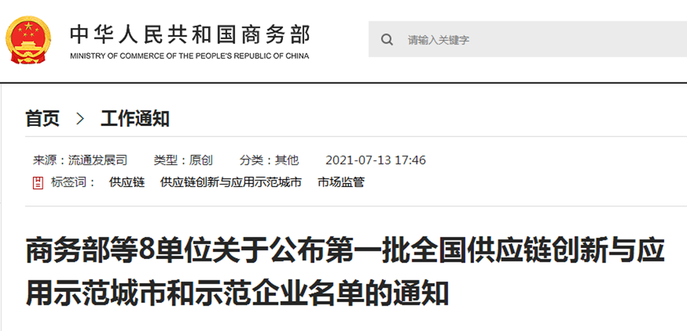 On July 12, 2021, the Ministry of Commerce and other 8 units officially announced the list of the first batch of national supply chain innovation and application demonstration cities and demonstration enterprises. Xiamen C&D Inc. (stock code: 600153) stood out from 266 pilot enterprises and was successfully selected as the first batch of 94 national demonstration enterprises by virtue of its advanced supply chain operation management concept and excellent supply chain management and coordination level.