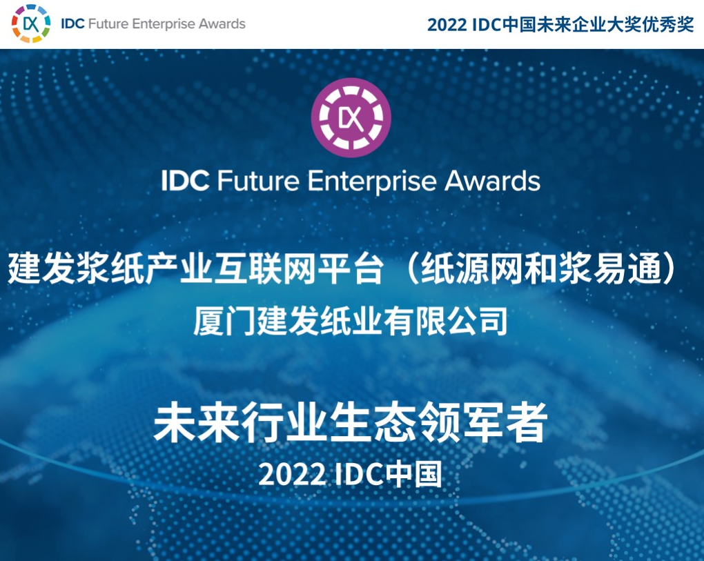International Data Corporation (IDC), the world's leading IT market research and consulting firm, announced the winners of the 2022 Future Enterprise Awards on September 1. Upon preliminary case selection, online public selection, IDC expert selection and industry expert assessment, the two Internet-based industry platforms of C&D Pulp & Paper, i.e. PaperSource Platform and PulpEasy Platform, took home the Excellence Award of Future Leader of Industry Ecosystems for their active exploration and leadership in the digital transformation of pulp and paper industry.
