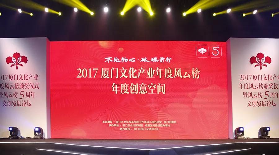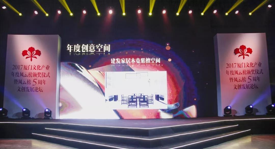 2017厦门文化产业年度风云榜于2018年3月30日揭晓。建发家居木竟紫檀空间喜获风云榜“年度创意空间”奖项。第五届“厦门文化产业风云榜”主题为“不忘初心、砥砺前行”,由厦门市文化改革发展工作领导小组办公室、厦门日报社主办,厦门报业传媒集团、湖里区湖里街道办事处承办,厦门日报《文创周刊》执行。厦门文化产业年度风云榜已成功举办四届,见证了一批批文化与科技融合型企业的成长与成熟,已成为厦门文化产业领域最受关注的年度大奖之一。